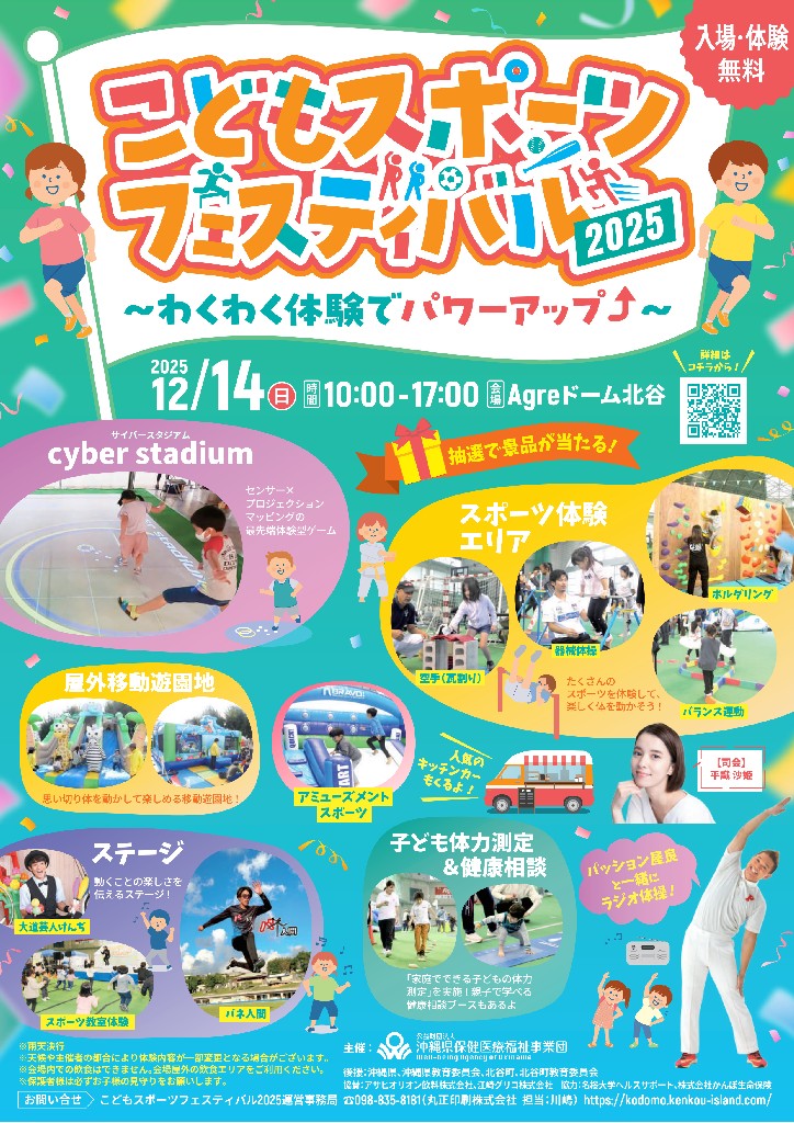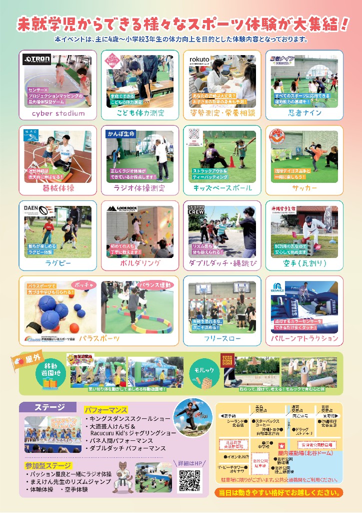 沖縄初上陸のセンサーとプロジェクションマッピングを掛け合わせた次世代型アトラクション「サイバースタジアム」やこどもの体力測定、空手の瓦割り、ラグビー、ボルダリングなど、無料で体験できます!また、県内人気のキッチンカーも多数出店します!